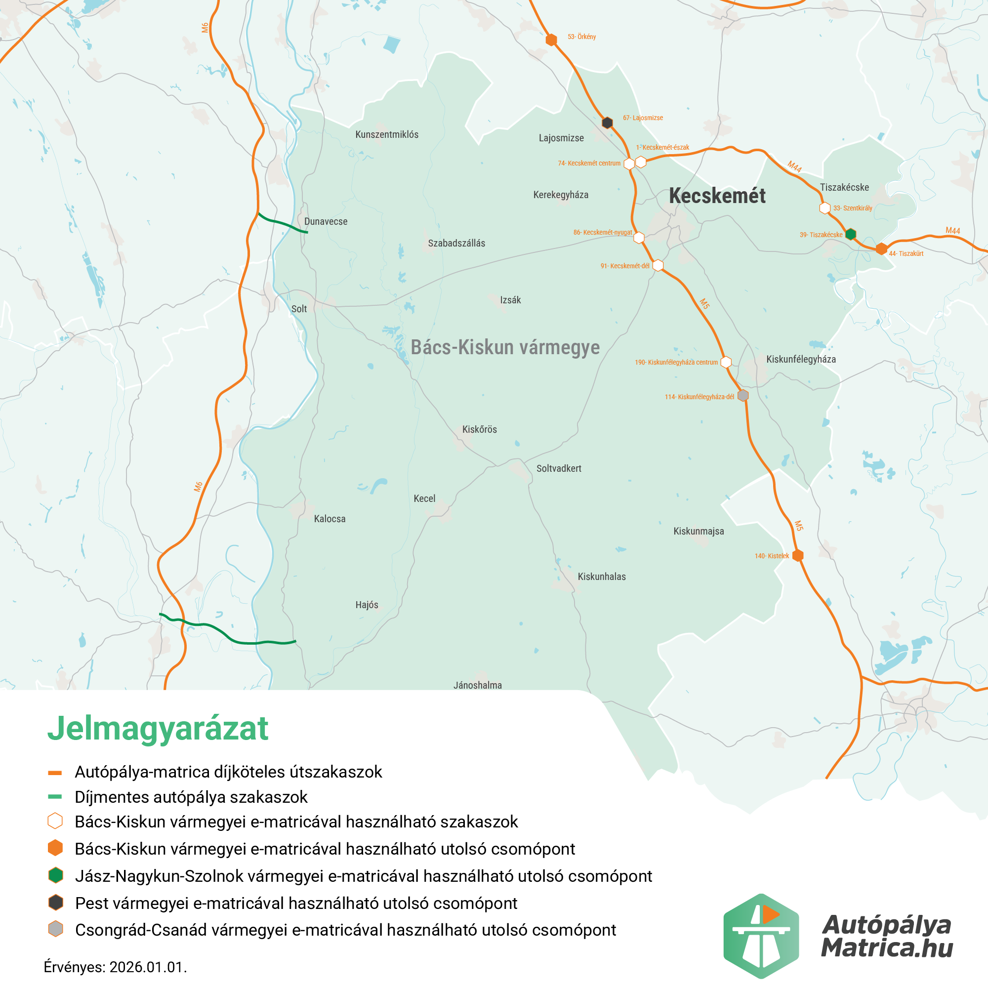 Az M44-es autóút 1-es M44/Kecskemét-észak csomóponttól a 44-es Tiszakürt csomópontig használható a Bács-Kiskun vármegyei matricával. Ha tovább haladnánk az M44-es autóúton, abban az esetben szükségünk lehet Jász-Nagykun-Szolnok vármegyei matricára, vagy bármelyik másik országos érvényességű (napi, heti, havi vagy éves országos) autópálya matricára.
