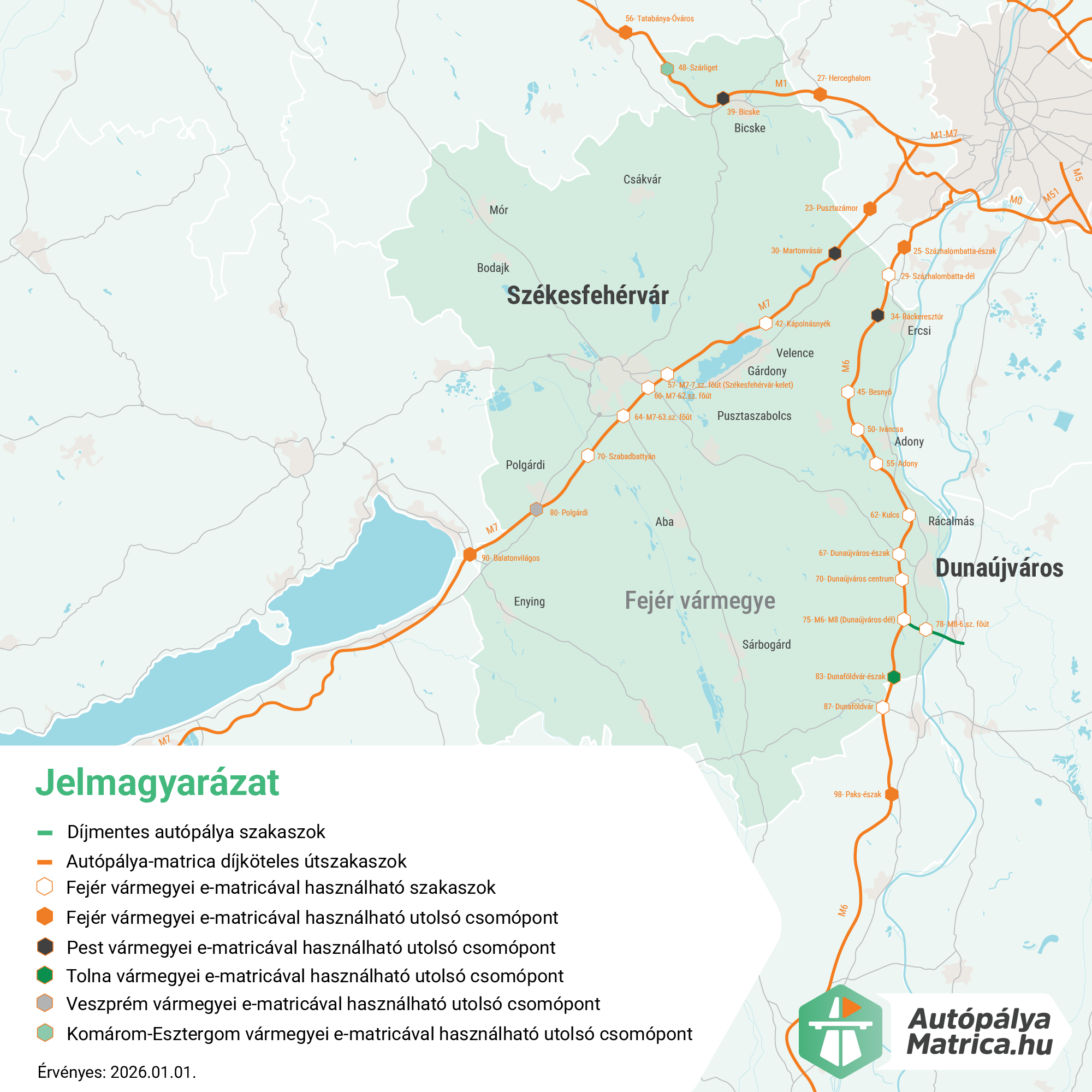 - Érvényes Fejér vármegye minden díjköteles útszakaszára, valamint a vármegyét követő első lehajtókra