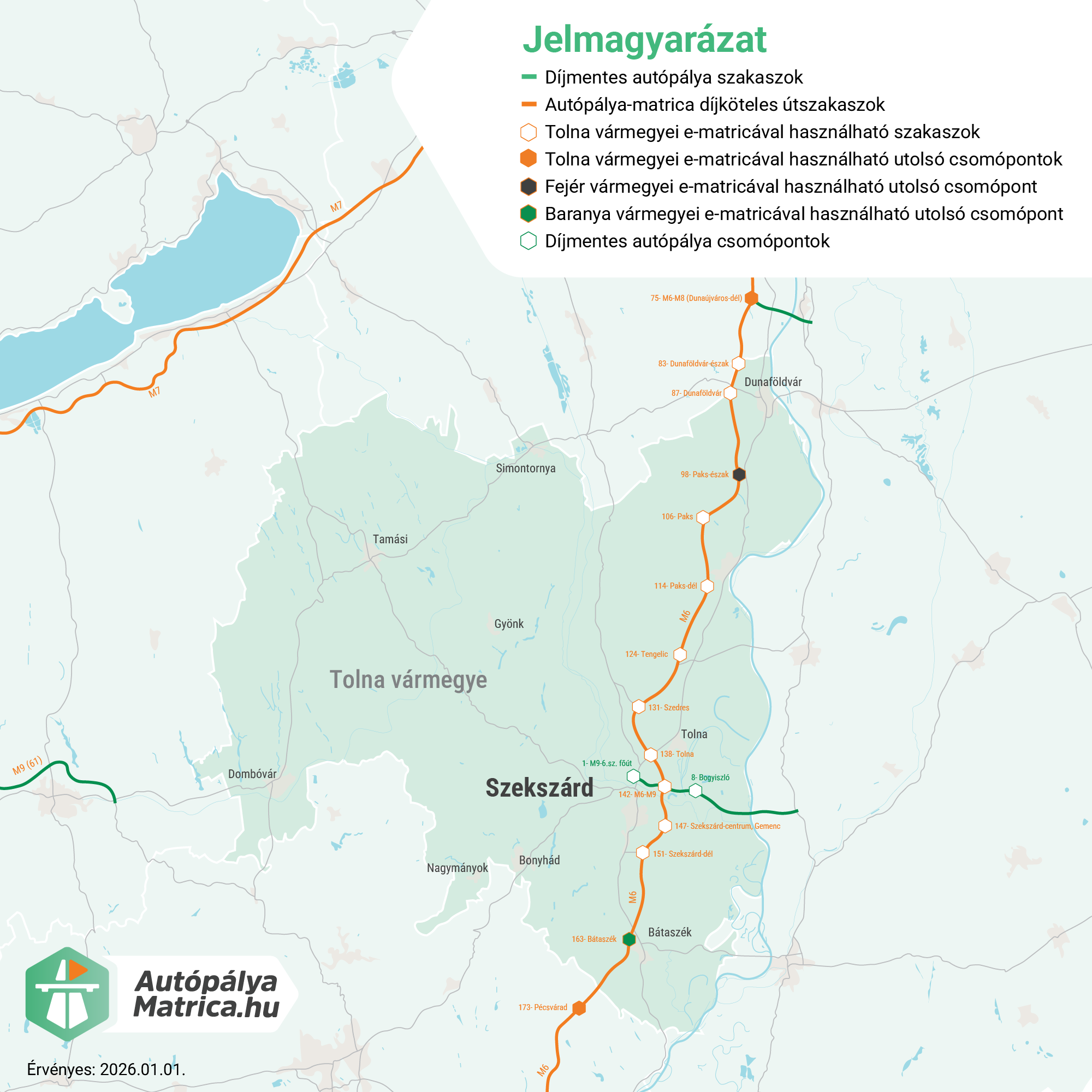 - Érvényes Tolna vármegye minden díjköteles útszakaszára, valamint a vármegyét követő első lehajtókra